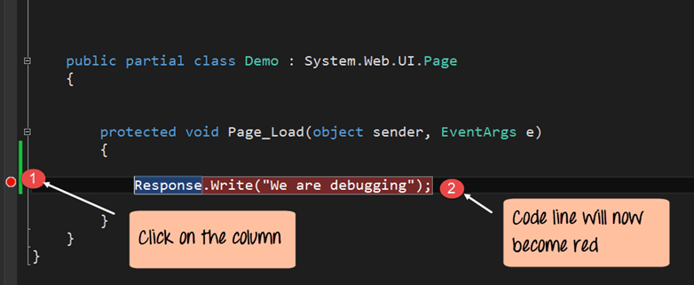 }Step 3) Now let's add a breakpoint. A breakpoint is a point in Visual Studio where you want the execution of the program to stop.