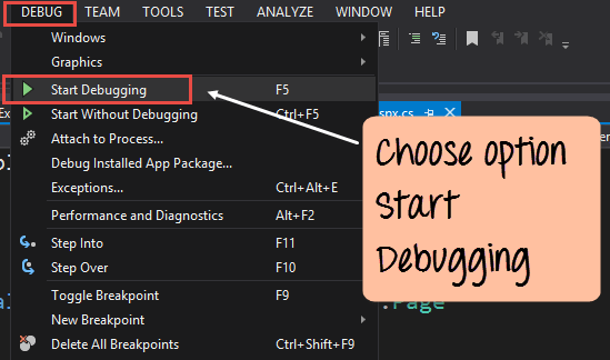 Step 4) Now you need to run your application using Debugging Mode. In Visual Studio, choose the menu option Debug->Start Debugging.