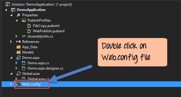 Step 1) Let's work on our 'DemoApplication'. Open the web.config file from the Solution Explorer.
