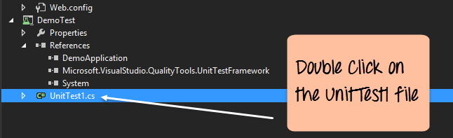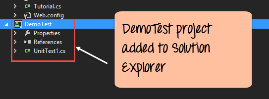 You will eventually see the DemoTest project added to the solution explorer. With this, you can also see other files like UnitTest1.cs, properties, etc. are generated by default.
