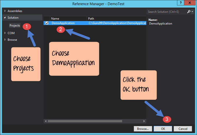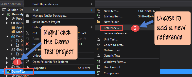 Step 1) To test our Demo Application, first test project needs to reference the Demo Application. Add a reference to the Demo.aspx solution.
