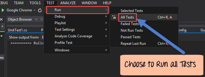 }Step 5) Now let's run our test project. For this, we need to go to the menu option Test->Run->All Tests