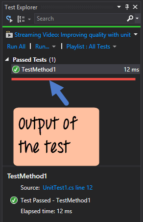 A test Explorer window will appear in Visual Studio. This will show the above result and display that a successful test was run in Visual Studio.