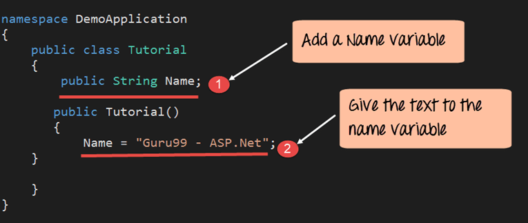 Step 4) Open the new Tutorial.cs file from "DemoApplication". Add the string "gtupapers – ASP.Net."