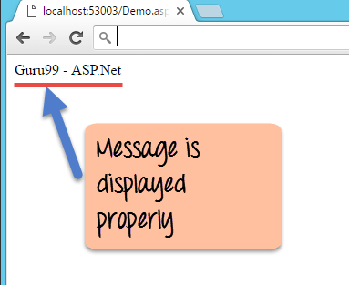<!DOCTYPE html> <html xmlns="http://www.w3.ore/1999/xhtml"> <head runat="server"> <title></title> </head> <body> <form id="form1" runat="server”> <div> <% DemoApplication.Tutorial tp=new DemoApplication.Tutorial();%> <%=tp.Name%> </div> </form> </body> </html>