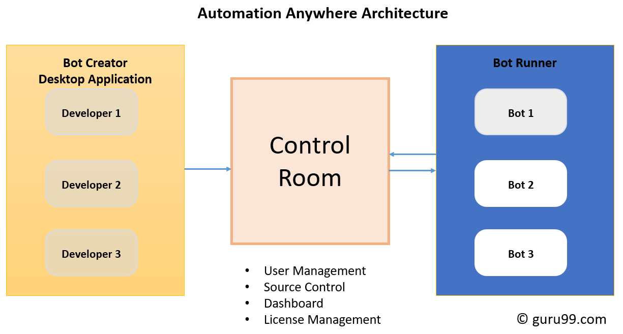 Developers use Desktop based applications to create bots. Their dev licenses are checked with that configured in the control room. On authentication, the code of the bots they create is stored in the control room. Different developers may create individual tasks/bots. These bots could be merged and executed at once.