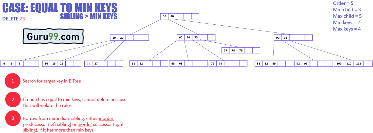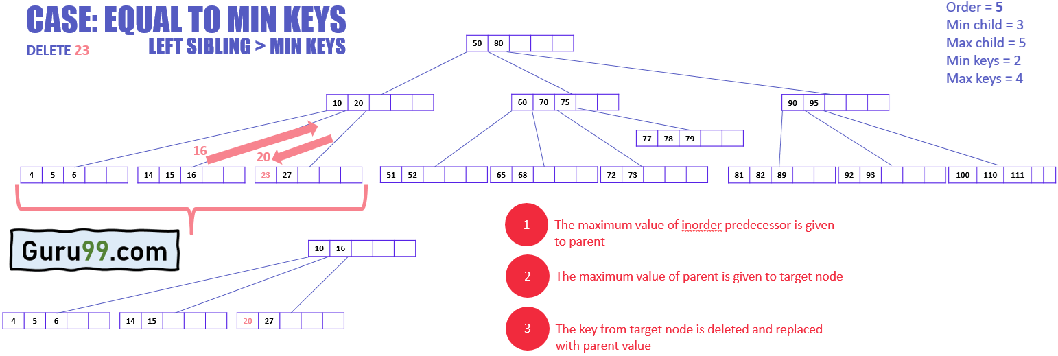 - The target node will borrow a key from immediate sibling, in this case, in-order successor (right sibling) because it's in-order predecessor (left sibling) has keys equal to minimum keys.