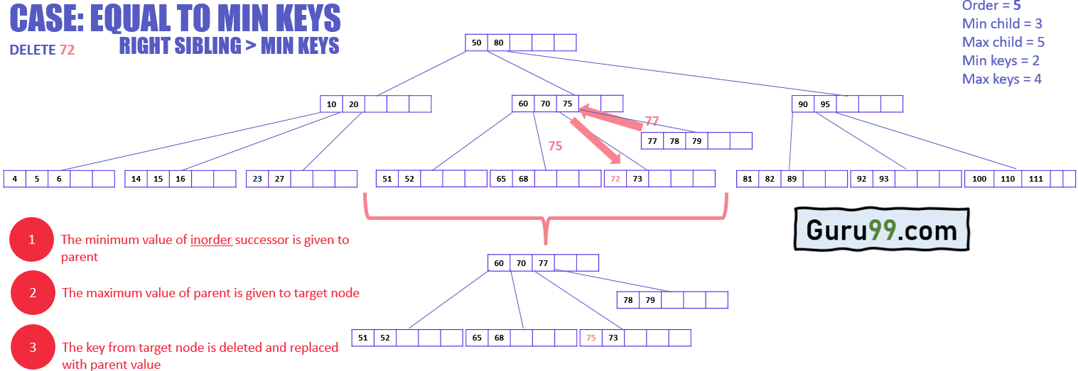 - If, after deletion, the target has less than min keys, then the target node will borrow max value from its sibling via sibling's parent.