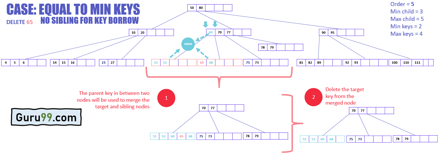 In the example below, the target node does not have any sibling that can give its key to the target node. Therefore, merging is required.
