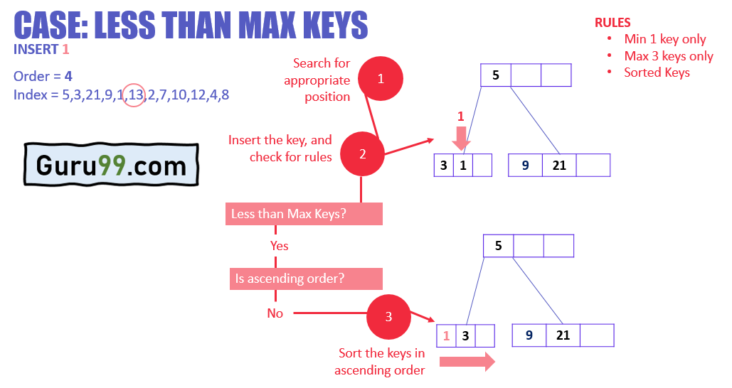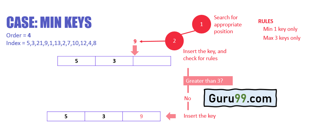 - After insertion, does the node have more than equal to a minimum number of keys, which is 1? In this case, yes, it does. Check the next rule.
