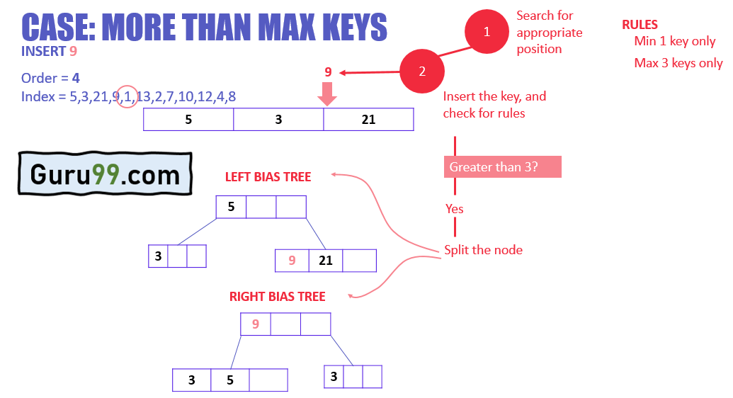 - The key is inserted to the target node, but it violates the rule of max keys.
