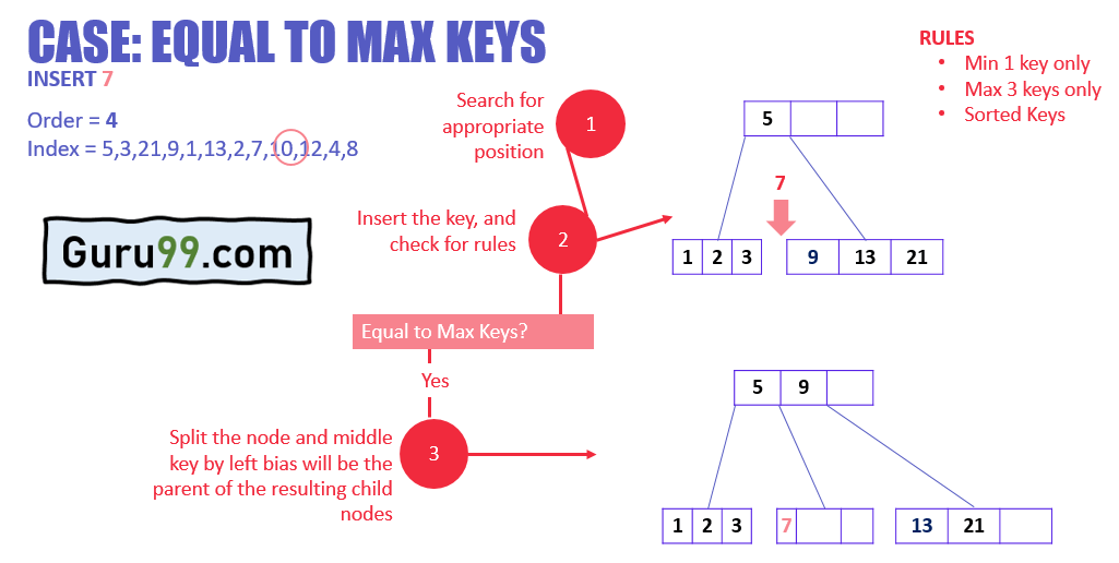 - The node will split, and the middle key will become the root node of the rest two nodes.