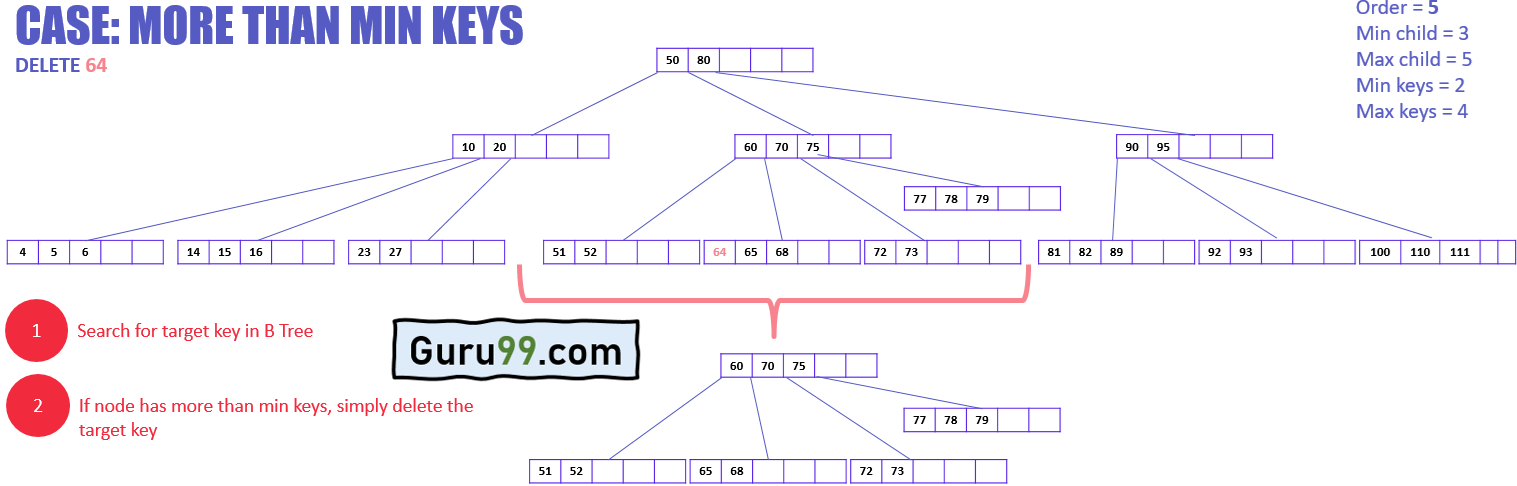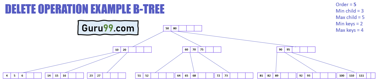The above diagram displays different cases of delete operation in a B-Tree. This B-Tree is of order 5, which means that the minimum number of child nodes any node can have is 3, and the maximum number of child nodes any node can have is 5. Whereas the minimum and a maximum number of keys any node can have are 2 and 4, respectively.