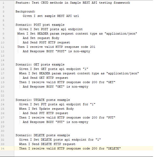So let's build our feature file Sample_REST_API_Testing.feature having feature as Performing CRUD operations on 'posts' service.