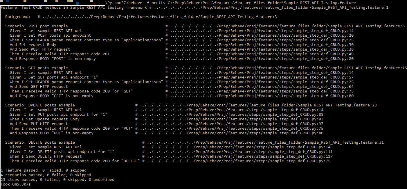 C: \Programs\Python\Python37>behave -f pretty C:\<your project path>\features\feature_files_folder\Sample_REST_API_Testing.feature
