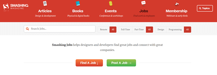 Smashing Magazine is a website that offers jobs for UX designers, web designers, JavaScript developers, Java developers, Mobile app developers, and more. You can easily search for remote, full time, and part-time jobs with the time commitment you like.
