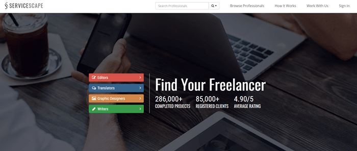 Servicescape freelance job website for working with startups and SMBs. It is one of the best freelancing platform for beginners that offers jobs for editors, translators, graphic designers, writers, etc. You can interact with clients in numerous ways by sending a message, making a phone call, etc.