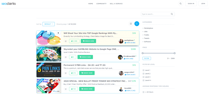 SEOclerk is a marketplace specifically designed for SEO service. It enables you to filter jobs by price, level, etc. Job seekers can search for on-page SEO, build backlinks, increase website traffic, online marketing, and more. You can receive emails for jobs that are similar to the applied job.