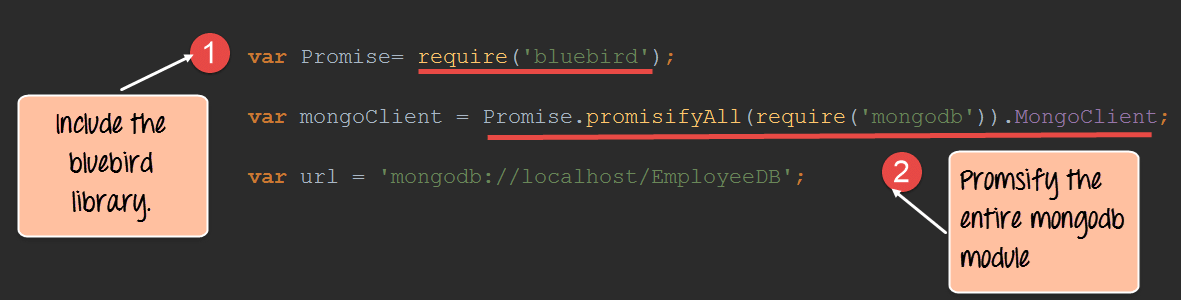 Step 2) The next step is to include the bluebird module in your code and promisify the entire MongoDB module. By promisify, we mean that bluebird will ensure that each and every method defined in the MongoDB library returns a promise.
