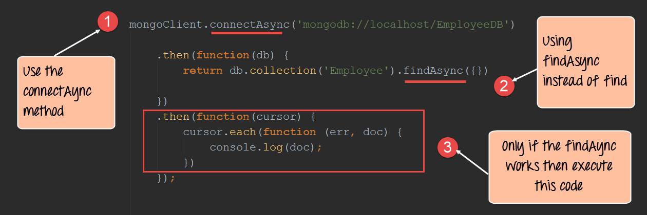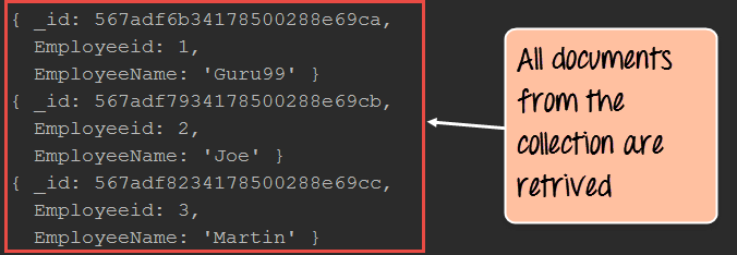 Our example will first establish a connection to the "Employee collection" in the "EmployeeDB" database. If "then" connection is established, then it will get all of the records in the collection and display them in the console accordingly.