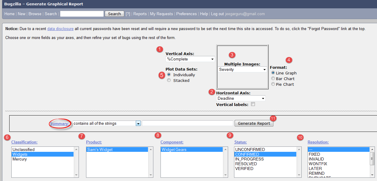 Graphical reports are one way to view the current state of the bug database. You can run reports either through an HTML table or graphical line/pie/bar-chart-based one. The idea behind graphical report in Bugzilla is to define a set of bugs using the standard search interface and then choosing some aspect of that set to plot on the horizontal and vertical axes. You can also get a 3-dimensional report by choosing the option of "Multiple Pages".