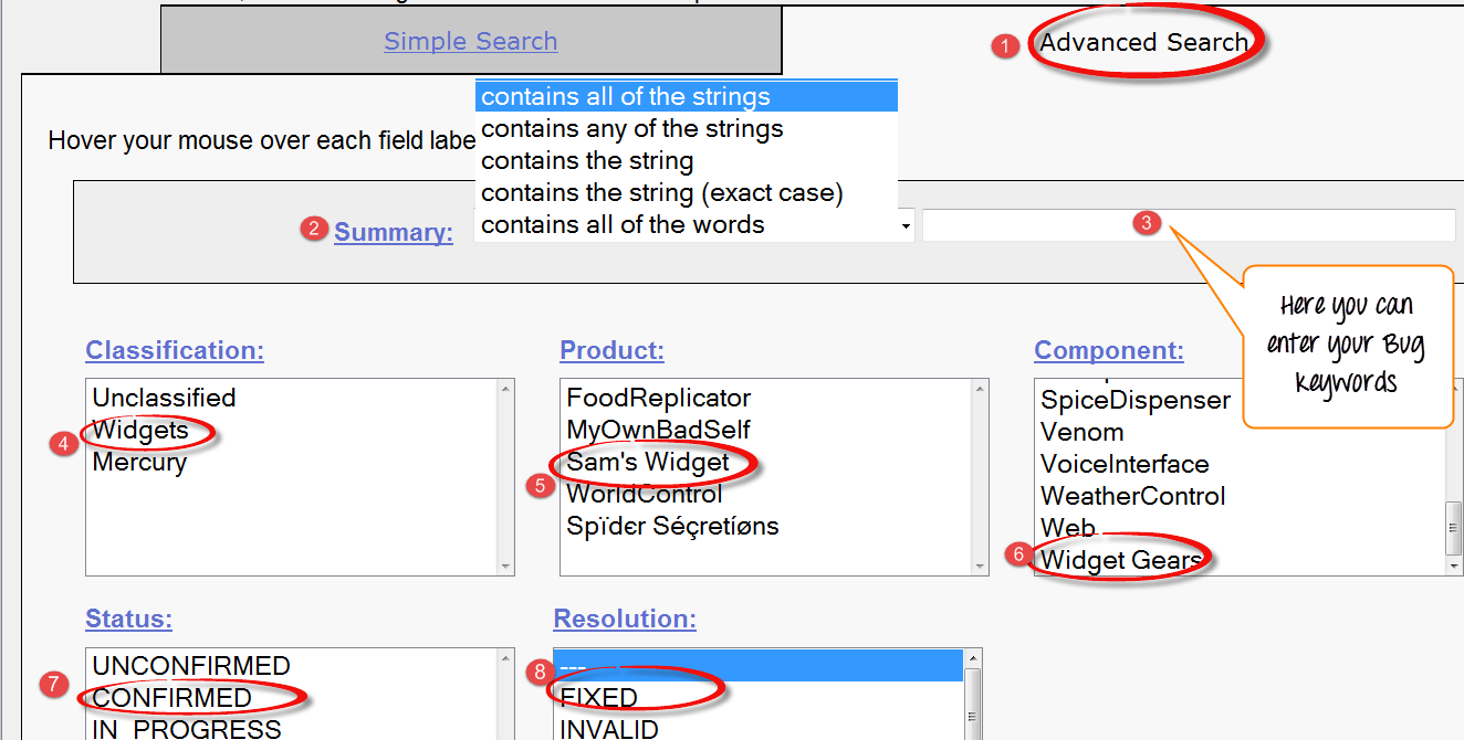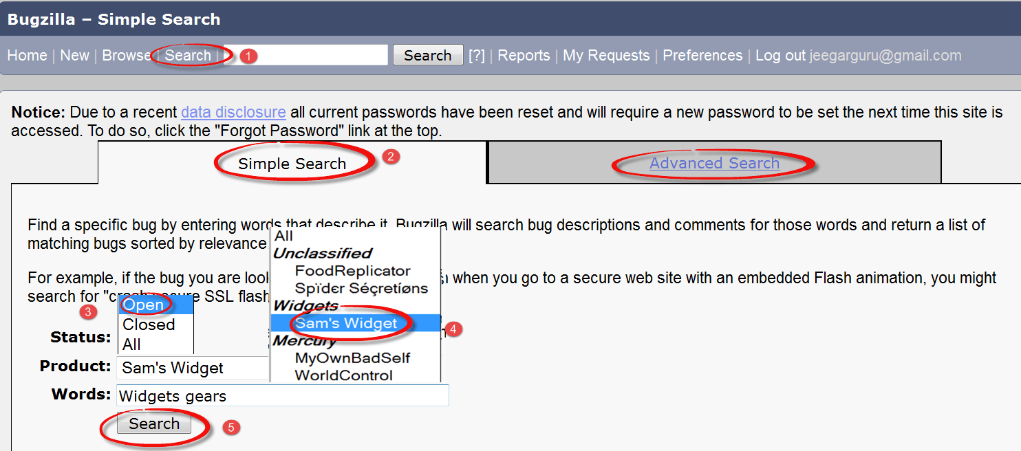 Bugzilla provides two ways of searching for bugs, they are Simple Search and Advance Search methods.