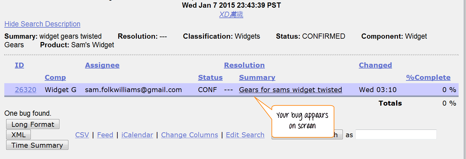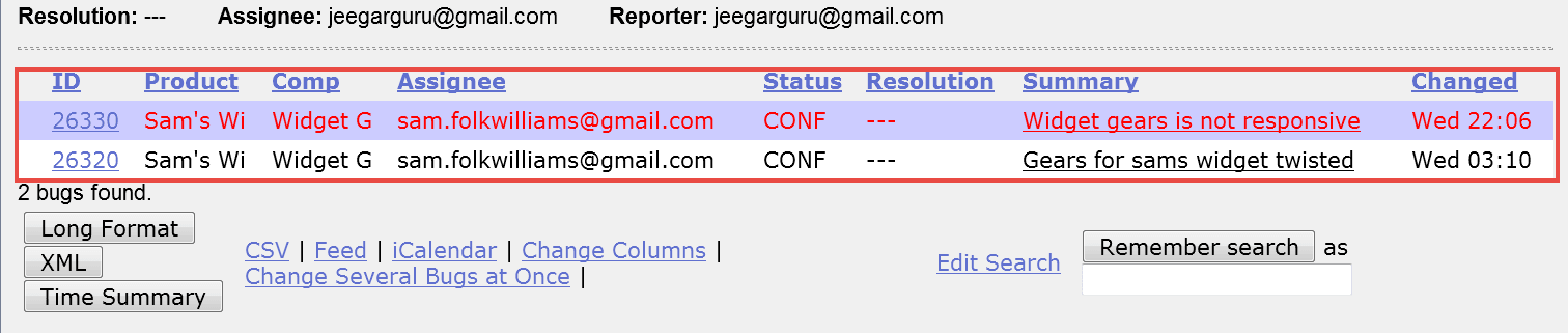 Also, at the bottom of the screen you have various options like how you want to see your bug - an XML format, in Long format or just Time summary. Apart from that you can also use other option like send mail to bug assignee, change several bugs at once or change column of the screen, etc.