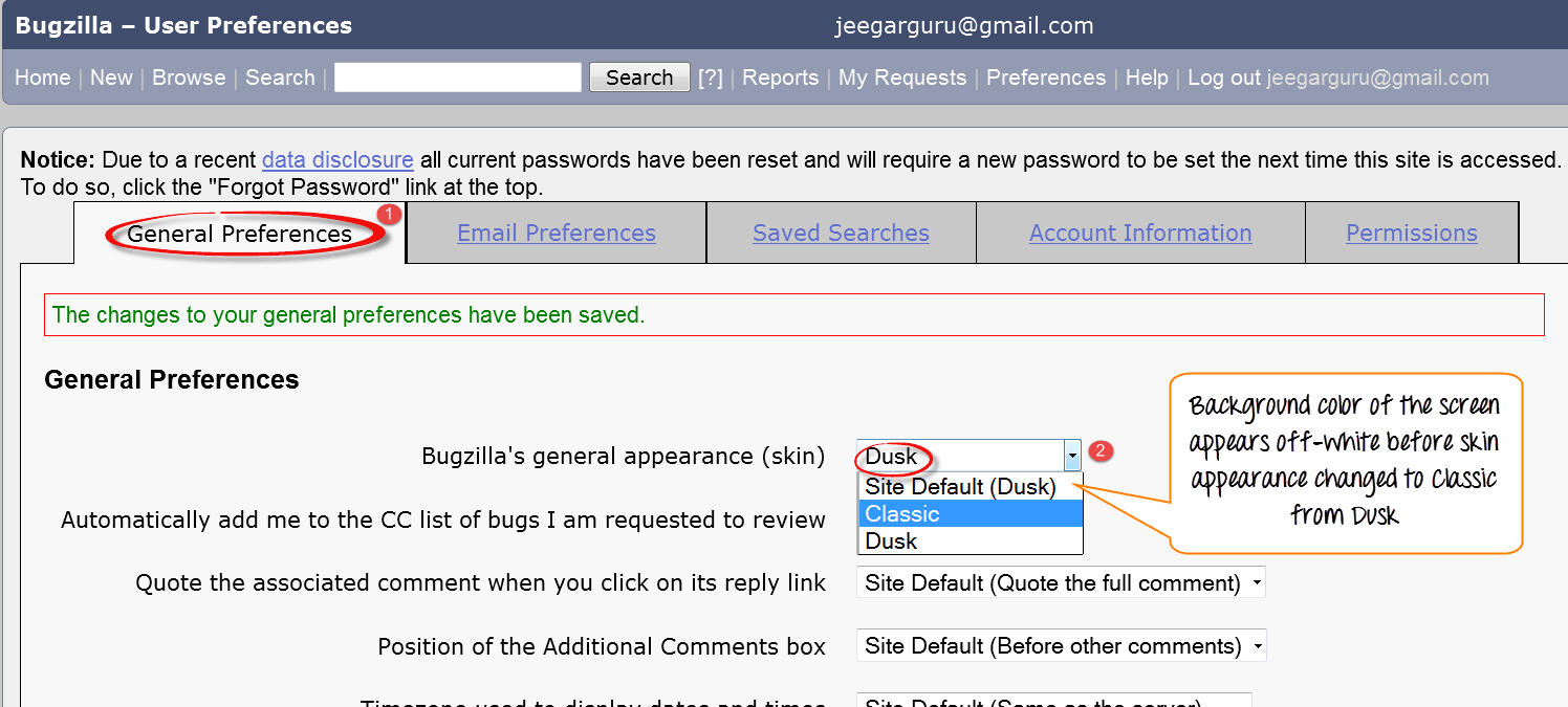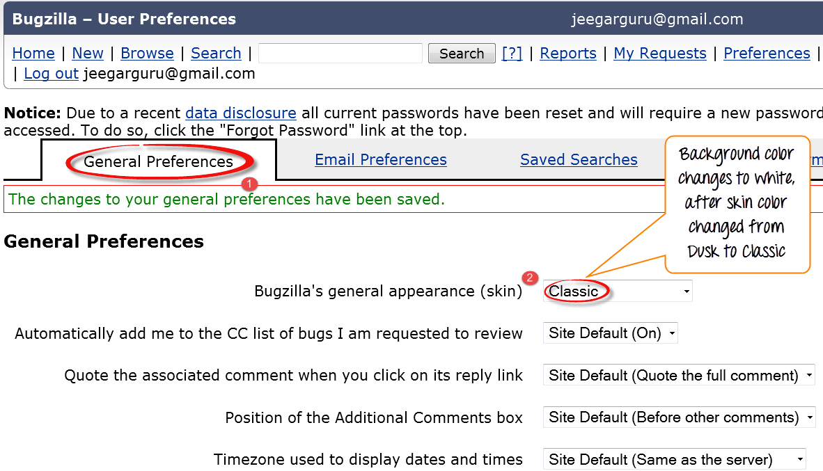 For general preferences, you have a various option like changing Bugzilla general appearance, a position of the additional comment box, automatically add me to cc, etc. Here we will see how to change the general appearance of the Bugzilla.