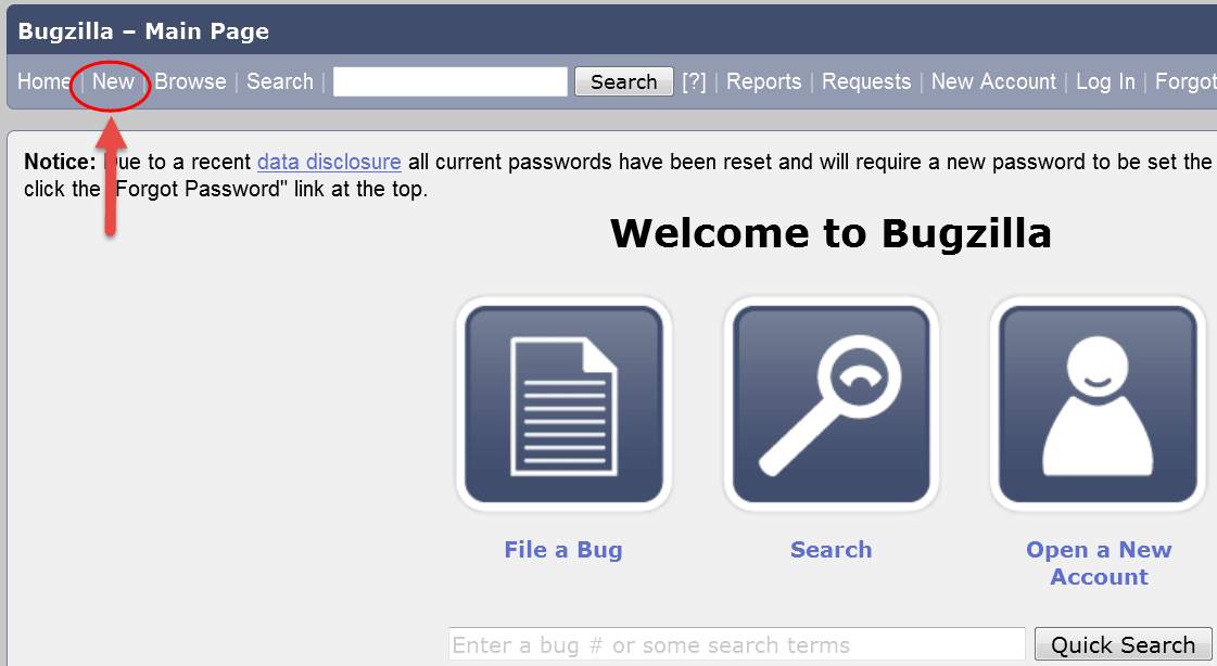 Step 1) To create a new bug in Bugzilla, visit the home-page of Bugzilla and click on NEW tab from the main menu