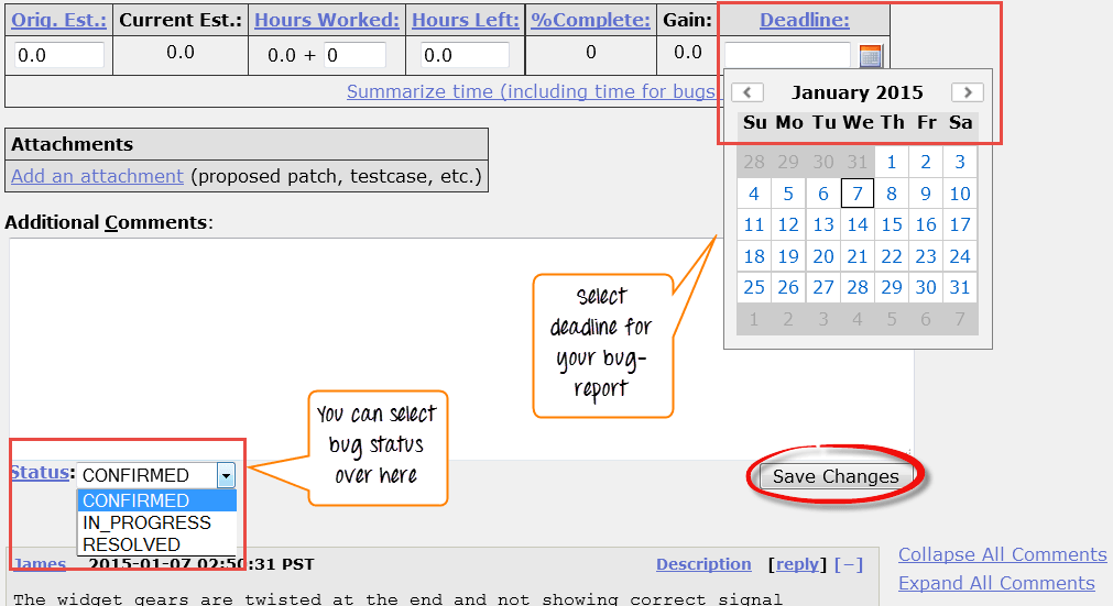 Step 5) In the same window if you scroll down further. You can select deadline date and also status of the bug. Deadline in Bugzilla usually gives the time-limit to resolve the bug in given time frame.
