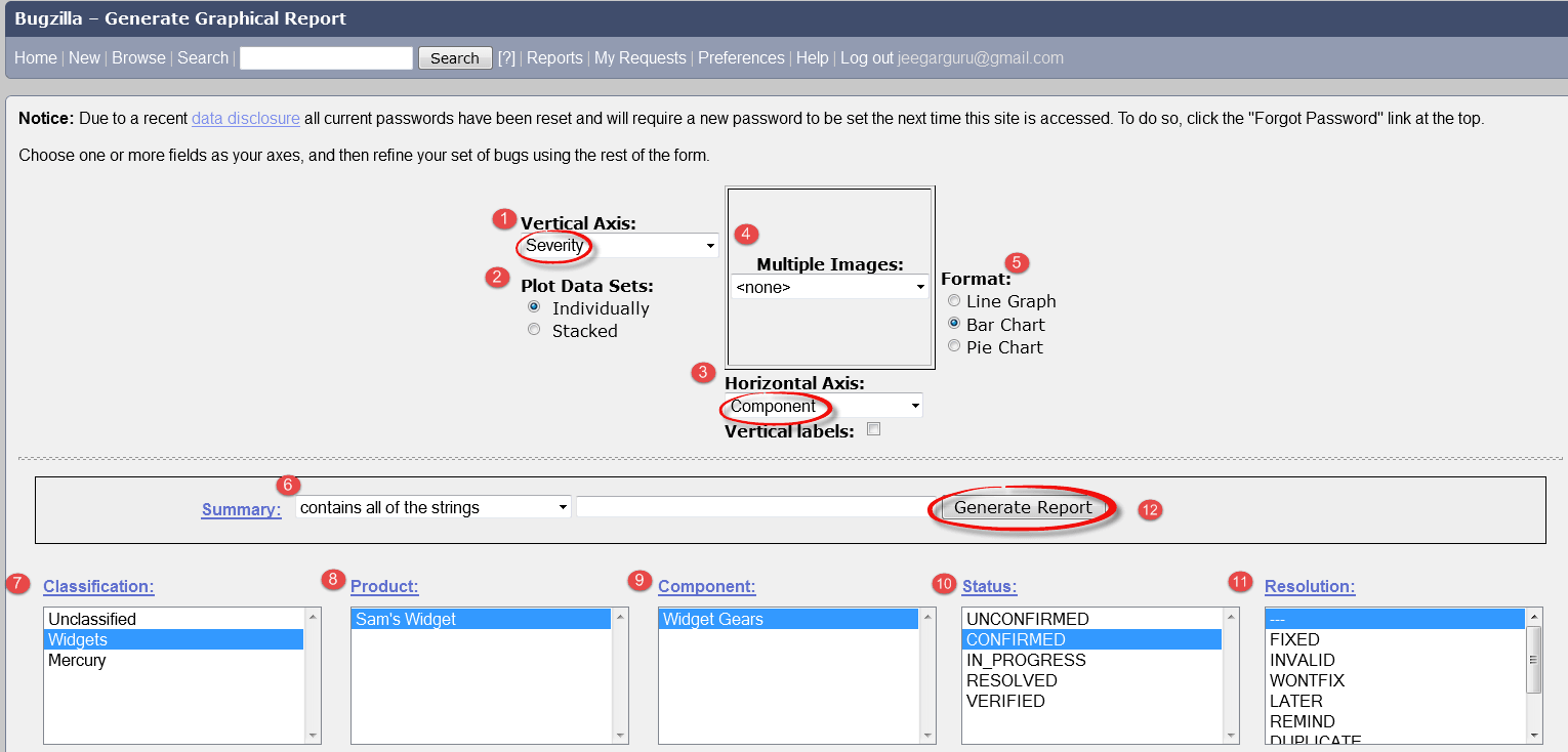 Reports are helpful in many ways, for instance, if you want to know which component has the largest number of bad bugs reported against it. In order to represent that in the graph, you can select severity on X-axis and component on Y-axis, and then click on generate a report. It will generate a report with crucial information.