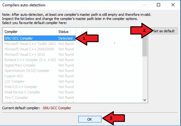Step 8) It will detect the gcc compiler automatically, set it as default.