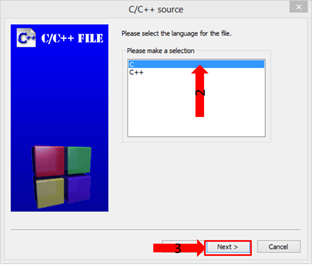 Step 4) To create the new file ,select a "C" file then click on "Next" button to continue.