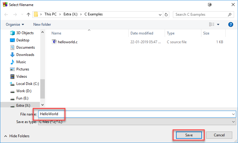Step 6) Select the path of your new C File then its name which has .c extension and save it.