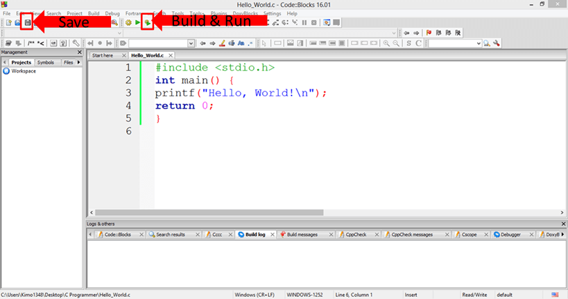 Step 8) Enter the code, save it and compile it by clicking on the "Build & Run "button.