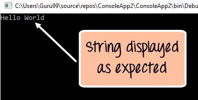 From the output, you can clearly see that the string "Hello World" is displayed properly. This is because of the Console.write statement causes this string to be sent to the console.