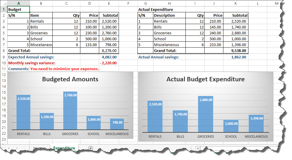 The variance between the budget and the actual expenditure give us the performance indicator of how disciplined we are when it comes to sticking to a budget.