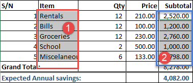 Hold Ctrl button on the keyboard and highlight the subtotals from 1 to 5 in subtotals column.
