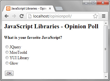 <html> <head> <title>JavaScript Libraries - Opinion Poll</title> </head> <body> <h2>JavaScript Libraries - Opinion Poll</h2> <p><b>What is your favorite JavaScript?</b></p> <form method="POST" action="index.php"> <p> <input type="radio" name="vote" value="1" />JQuery <br /><input type="radio" name="vote" value="2" />MooToolsl <br /><input type="radio" name="vote" value="3" />YUI Library <br /><input type="radio" name="vote" value="4" />Glow </p> <p><input type="submit" name="submitbutton" value="OK" /></p> </form> </body> </html>