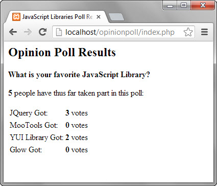 Assuming you have saved the files in opinionpoll folder, browse to the URL http://localhost/opinionpoll/