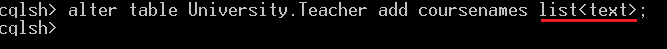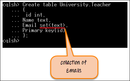 Create table University.Teacher ( id int, Name text, Email set<text>, Primary key(id) );