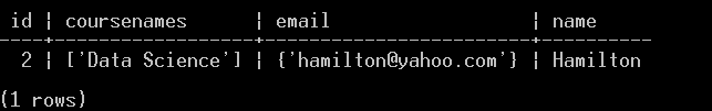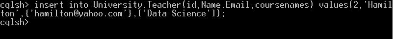 insert into University.Teacher(id,Name,Email) values(2,'Hamilton',{This email address is being protected from spambots. You need JavaScript enabled to view it.'},[Data Science']);Here is the snapshot that shows the current database state after insertion.
