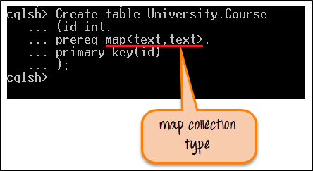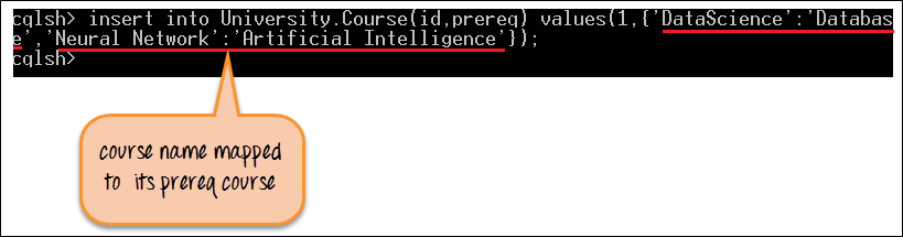 insert into University.Course(id,prereq) values(1,{'DataScience':'Database', 'Neural Network':'Artificial Intelligence'});