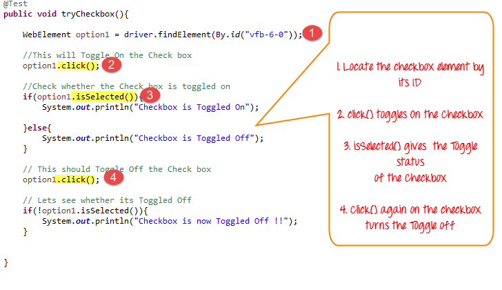 | Check Box, Radio Button | click() | used to toggle the element on/off |