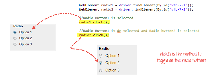 Using http://demo.gtupapers.com/test/radio.html for practise, see that radio1.click() toggles on the "Option1" radio button. radio2.click() toggles on the "Option2" radio button leaving the "Option1" unselected.
