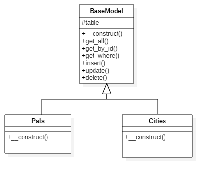 The following image shows the class diagram and how Pals and Cities child models relate to the parent model BaseModel.