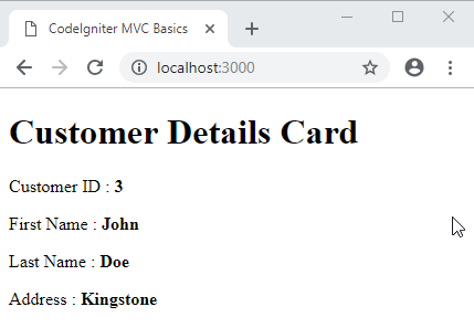 <!DOCTYPE html> <html lang="en"> <head> <meta charset="utf-8"> <title>CodeIgniter MVC Basics</title> </head> <body> <h1>Customer Details Card</h1> <p>Customer ID : <strong><?=$customer['id']?></strong></p> <p>First Name : <strong><?=$customer['first_name']?></strong></p> <p>Last Name : <strong><?=$customer['last_name']?></strong></p> <p>Address : <strong><?=$customer['address']?></strong></p> </body> </html>