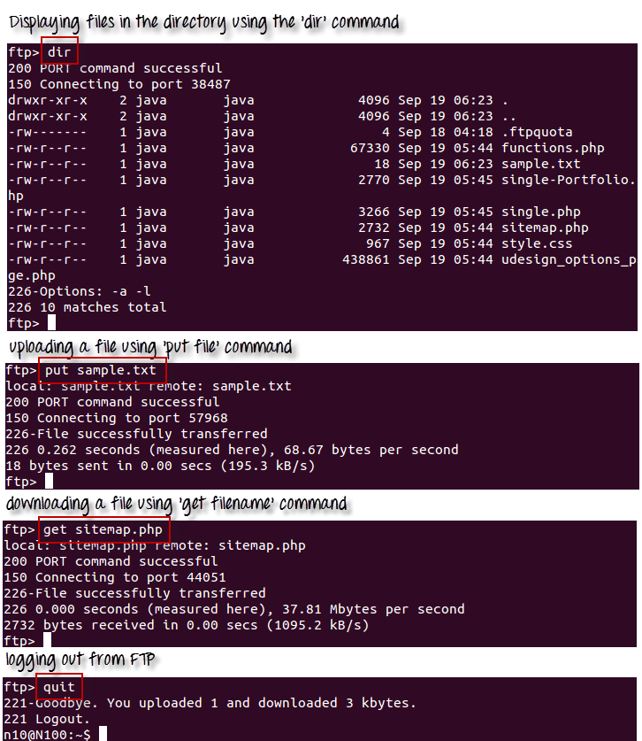 Once a connection is established, and you are logged in, you may use the following commands to perform different actions.