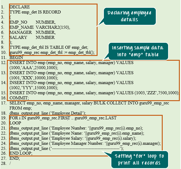 SELECT emp no,emp_name,manager,salary BULK COLLECT INTO gtupapers_emp_rec