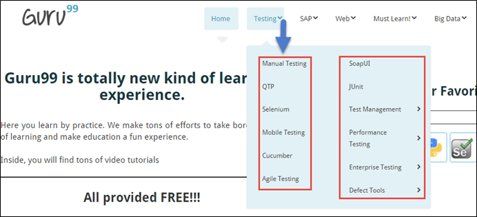 Click on Testing Drop Down menu as per the below snap show and see various "subcomponents" of Testing component. So the sub-components displayed are Manual Testing, SOAPUI, QTP, JUnit, Selenium, Test Management, Selenium, Mobile Testing, etc.